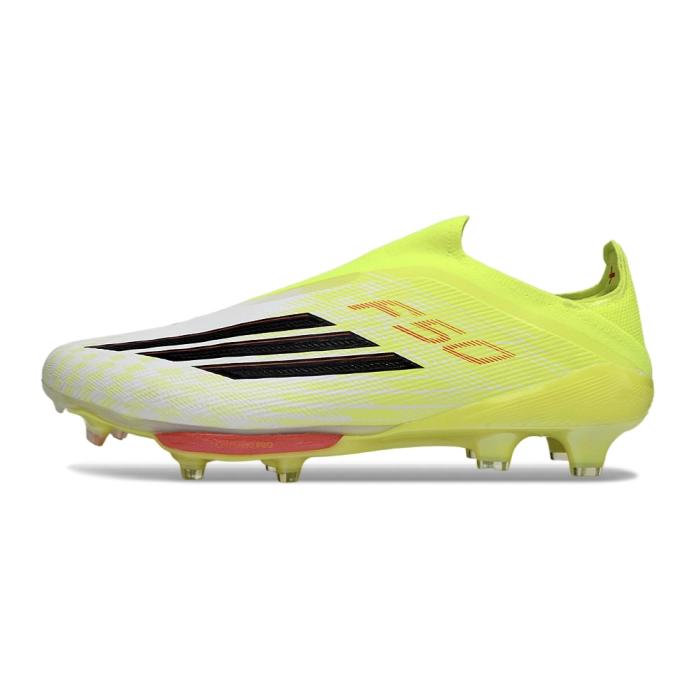 The adidas F50+ Elite Laceless FG arrives as part of the 'Born For Goals' pack—Lucid Lemon to White fade with Black accents. Built with Fibertouch upper, Compressionfit tongue and Sprintframe 360 soleplate, it delivers explosive speed.