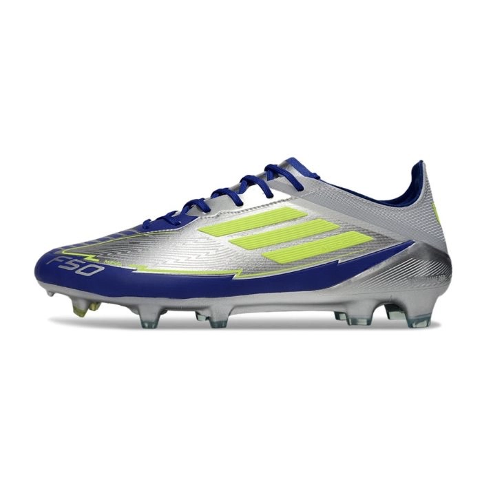 The adidas F50 Elite x Messi FG arrives as part of the 'La Vida Rapida' pack—shimmering Silver Metallic, bold Solar Yellow and vibrant Lucid Blue accents. Built with a HybridTouch upper and Messi's preferred "burrito" tongue, it delivers explosive speed when every second counts.