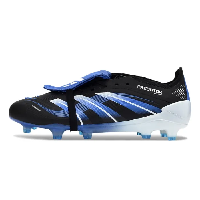 The adidas Predator Elite Fold-Over Tongue FG arrives as Jude Bellingham's third signature edition—sleek Core Black, energized by icy Glory Blue accents on the STRIKESKIN and fold-over tongue. It is engineered for the player who demands the absolute best in ball manipulation, power, and comfort on firm, natural grass.